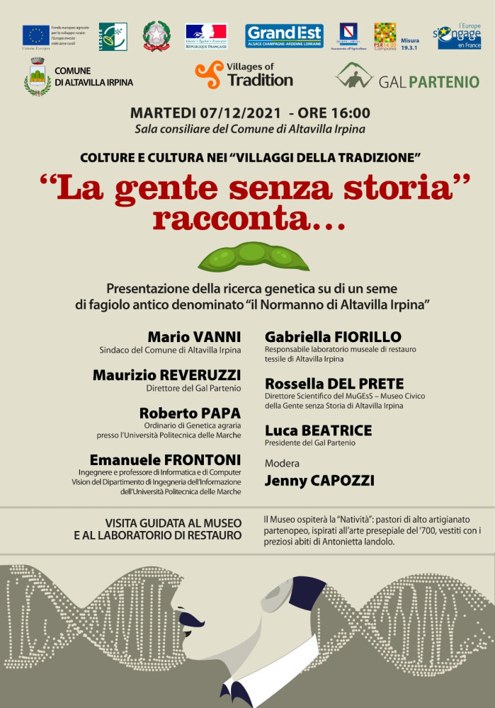 Al centro dell’incontro, che sarà moderato da Jenny Capozzi, la presentazione della ricerca genetica su un seme di fagiolo antico denominato “il Normanno di Altavilla Irpina“. Interverranno Mario Vanni, sindaco di Altavilla Irpina, Maurizio Reveruzzi, direttore del Gal Partenio, Roberto Papa, Ordinario di Genetica Agraria presso l’Università Politecnica delle Marche, Emanuele Frontoni, ingegnere e professore di Informatica e di Computer Vision del Dipartimento di ingegneria dell’Informazione dell’Università Politecnica delle Marche, Gabriella Fiorillo, responsabile del laboratorio museale di restauro tessile di Altavilla Irpina, Rossella del Prete, Direttore Scientifico del MuGesS – Museo Civico della Gente Senza Storia di Altavilla Irpina, Luca Beatrice, Presidente del Gal Partenio.